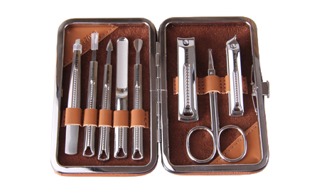 包裝規(guī)格:132mm*85mm*27mm 產(chǎn)品規(guī)格:124mm*79.5mm 單套重量:214g 材質(zhì):PU+420不銹鋼+鋅合金+碳鋼 配件:RM6433指甲鉗、美容剪、斜口指甲鉗、指甲銼、暗瘡針、耳挖、刮刀